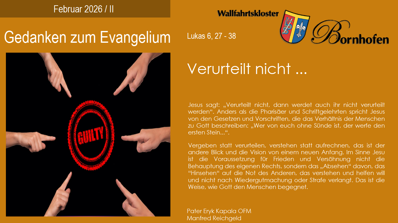 Vergeben statt verurteilen, verstehen statt aufrechnen, das ist der andere Blick und die Vision von einem neuen Anfang. Im Sinne Jesu ist die Voraussetzung für Frieden und Versöhnung nicht die Behauptung des eigenen Rechts, sondern das „Absehen“ davon, das “Hinsehen“ auf die Not des Anderen, das verstehen und helfen will und nicht nach Wiedergutmachung oder Strafe verlangt. Das ist die Weise, wie Gott den Menschen begegnet.